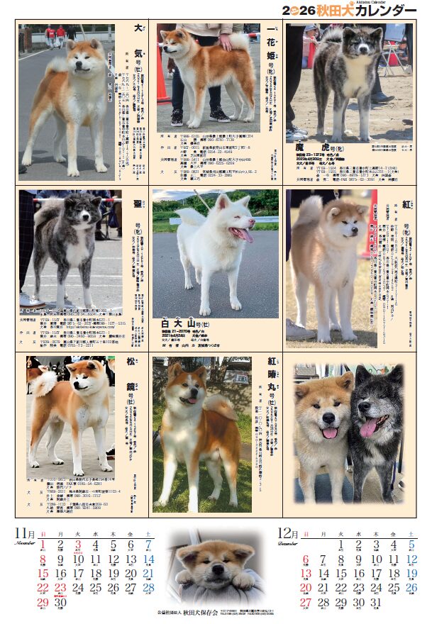 今年も愛犬家の皆様からのご協力で、2026年版秋田犬カレンダーを刊行することができました。全53頭が掲載されています。